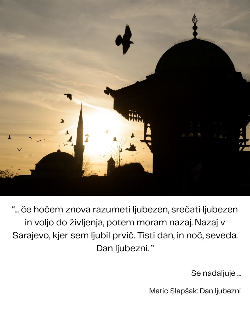 Jeseni tistega leta sva se uspela celo videti. Vmes sva si izmenjala nekaj sporočil, pa čeprav sva oba vedela, da je bilo vse, kar se je zgodilo, pač nekaj ne le edinstvenega, ampak tudi enkratnega. Zagreb je bil tako zelo blizu, a obenem daleč. Ljubezen na daljavo je nemogoča, ko si nekoga tako zelo želiš, tako zelo ljubiš. Saj sem razmišljal, da bi šel jeseni študirat v Zagreb in … in mogoče bi se vse skupaj obrnilo drugače. A pač nisem in se ni. A sem v poznem novembru, na prav posebno žalosten, mračen in bridko deževen dan, z vlakom šel do Zagreba. Ana me je čakala na glavni železniški postaji, šla sva na sprehod po mestu, a to preprosto ni bilo več to. Ne Zagreb, tudi v Ljubljani bi bilo najbrž enako. Sarajevo je bilo najino mesto. Mesto najine ljubezni, dneva najine ljubezni.